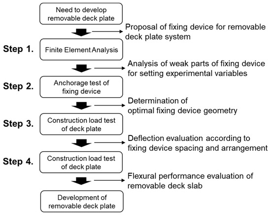 In this study, the procedure shown in Figure 1 was conducted to develop a new type of removable deck plate. First, the details of the fixing device were proposed, and the weak part of the fixing device was first analyzed by FEA to verify its safety. Based on the analysis results, anchorage tests were performed to find the optimal fixing device shape. Factors affecting deflection during construction were analyzed through the construction load test, and finally, the flexural performance was evaluated.