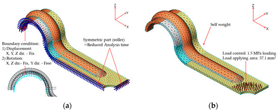 FEA modeling of fixing device: (a) boundary condition; (b) load condition.