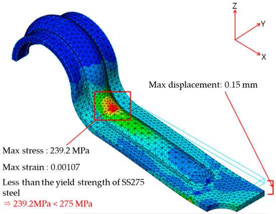 The results of the finite element analysis are presented in Figure 4, with von Mises stress used to evaluate stress distribution with respect to yield. The stress was concentrated in the curved part at the starting point of the load control. The variables affecting the shape of the fixing device were determined by the results of the finite element analysis.