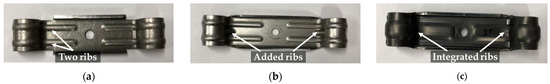 For the R-type fixing device, the maximum load increased with thickness. However, the failure shape and the location of the load concentration differed depending on the thickness (Figure 9). Thinner thicknesses exhibited severe bending at the end portion (W), while both the center and end portions underwent 1.6T deformation. In the thickest 2.3T specimen, the bending was concentrated in the center. Compared with the 1.6T and 2.3T specimens, the strain at the end (W) progressed faster than at the center (C), and the center and end were destroyed almost equally at the same strain in the 1.6T and 2.3T specimens, as depicted in Figure 12a.