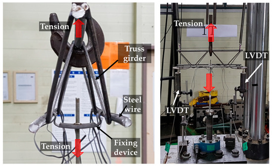 The anchoring performance of the fixing device was assessed by a tensile test using a universal testing machine with a 1000 kN capacity, based on the outcomes of the finite element analysis. Measurements of displacement during the anchoring performance test were taken by installing a linear variable displacement transducer (LVDT) at each end of the lattice girder, and a strain gauge measured the strain of the fixing hardware (Figure 5).