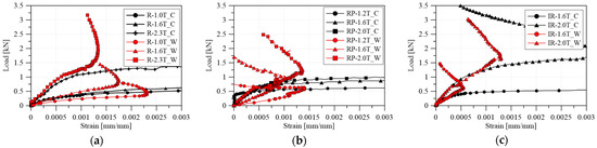 Load–strain relationship: (a) R series; (b) RP series; (c) IR series.