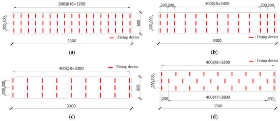 This section evaluated the structural safety of the local destruction of the fixing device for the construction load, which may occur when developing a removable deck plate. To examine the workload during construction and the deflection during slab placement, the installation spacing and installation method of the fixing device were varied. Specimen details are presented in Figure 13, and the experimental variables are listed in Table 3.