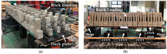 Bricks were used to simulate the uniformly distributed load during concrete placement at an actual construction site (Figure 14). The thickness of the deck was set to 250 mm, and the weight of the total deck volume was calculated using a concrete density of 23 kN/m3, as suggested by KDS 21 50 00:2022 [16]. A concentrated load of 1.5 kN was applied to the maintenance workers. The point-to-point distance was set to 3000 mm by installing hinges 150 mm inside both sides of the specimen. To measure the amount of deflection according to the load, an LVDT was installed at the fourth place from the distance between the points, and strain gauges were attached to the upper and lower reinforcing bars and the fixing device, as detailed in Table 3.