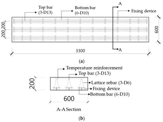Flexural performance test specimen details: (a) plan view; (b) section view (unit: mm).