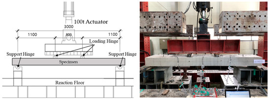 A slab specimen was fabricated using a truss girder and fixed hardware to evaluate the flexural performance after placement. A four-point load was applied using an actuator with a capacity of 1000 kN, as shown in Figure 17 and Figure 18, using the fixed hardware installation interval as a variable. The slab specimens were divided into 200, 300, and 400 mm installation intervals for the fixed hardware (Table 6). The arrangement was divided into straight and staggered types, as in the casting deflection test, with a point distance of 3000 mm.