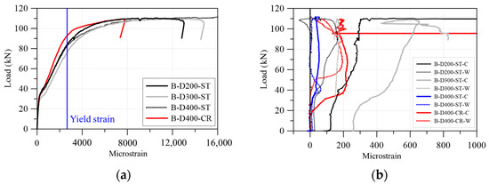 Load–strain relationship of construction load test: (a) B-D200-ST; (b) B-D300-ST; (c) B-D400-ST; (d) B-D400-CR.
