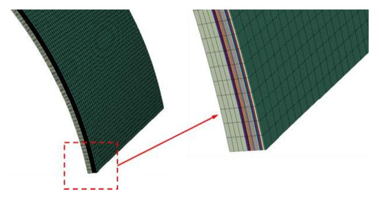 The FML structure studied in this paper is shown in Figure 1. The main body of the structure is made of carbon fiber and aluminum alloy, the radius of curvature is 30–120 mm, the total thickness is 2.4 mm, and the axial length is 50 mm. One-quarter of the model is used for loading due to the double symmetry of the structure. The boundary conditions of the model are fixed. The model is subjected to 25 g TNT equivalent explosive shock wave loading 100 mm from the center.