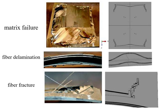 The comparison results are shown in the Figure 9. Three different failure modes of carbon fiber are compared: matrix failure, fiber delamination, and fiber fracture failure. The results show that the failure modes predicted by numerical simulation are basically consistent with the experimental results.
