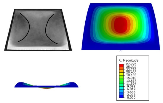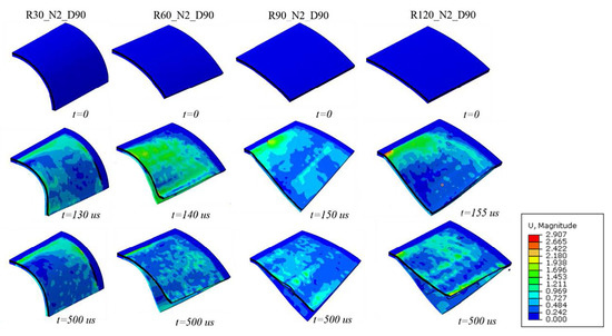 The impact dynamic response of aluminum alloy laminates was tested by Puneet et al. [19], and the experimental results were compared with the simulation results. In this paper, the exposed area of aluminum alloy panel is 203.2 × 203.2 mm. Three specimens are flat plate and cylindrical laminate with curvature radii of 304.8 and 111.8 mm, respectively. Shock wave loading is carried out on the specimens through the shock tube. The clamping mode and boundary conditions are the same as those in Section 3.1. The simulation results and test results are compared as shown in Figure 10.
