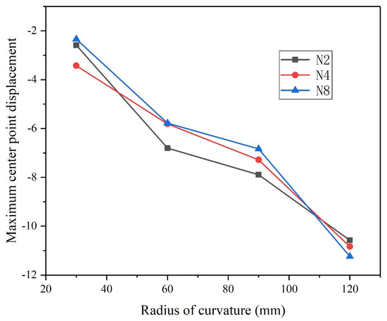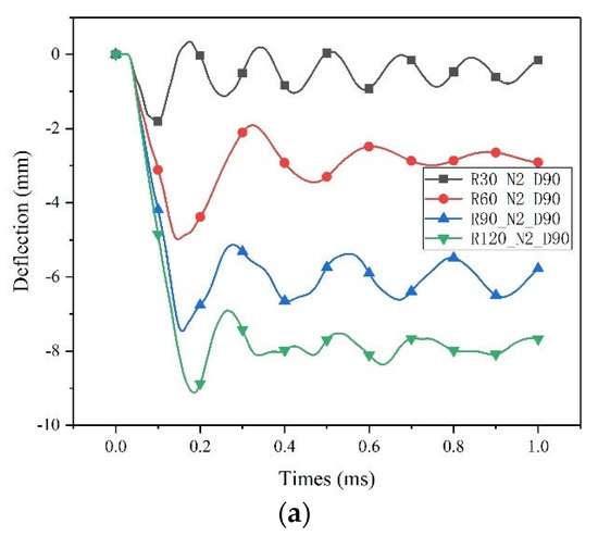 As the most important structural parameter of the surface structure, the curvature has the most direct effect on structural deformation. Figure 12 compares the deformation history of double-layer CARALL (layering along the circumferential direction) with different curvature radii, and Figure 13 shows its corresponding deformation history at the center point and deformation cloud diagram at the maximum deformation time.