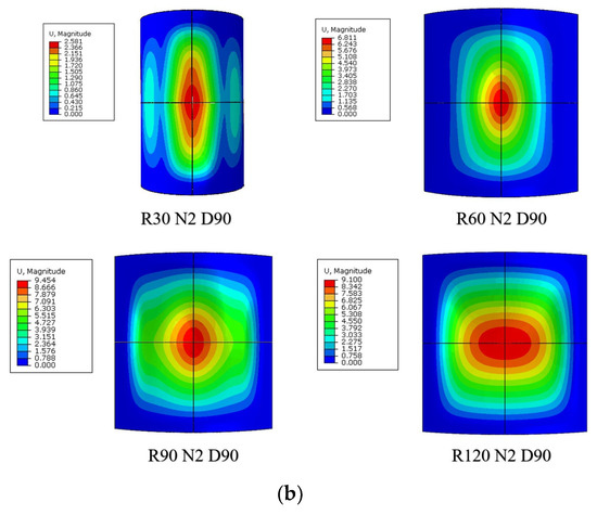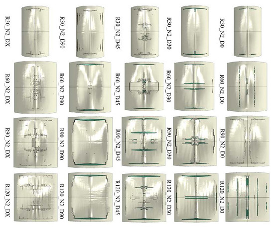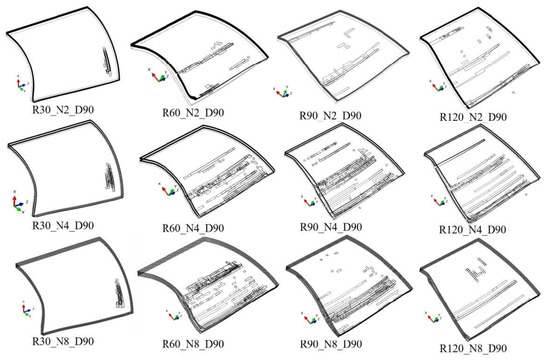 As shown in Figure 12, when the radius of curvature is small, R30_N2_D90 has a small deformation area and deformation value, and the overall deformation mode of the R30_N2_D90 structure is the central sag deformation. In the fiber part, the failure of lamination between fiber layers and between the fiber layer and aluminum plate is the main failure. The structure has strong shape recovery ability and small residual permanent deformation. With the increase in curvature radius, the deformation area and the deformation amount of R60_N2_D90 increase. The overall deformation mode of the R60_N2_D90 structure is the central sag deformation mode and the overall bending deformation mode. The delamination failure between the fiber and the aluminum plate and the delamination failure between fiber layers both increases. When the radius of curvature continues to increase, R90_N2_D90 and R120_N2_D90 show obvious overall bending deformation, the deformation amount and deformation area both increase, and there are obvious axial fractures in the center of the fiber layer, as well as along the clamping edge. The number and width of fractures increase with the radius of curvature.