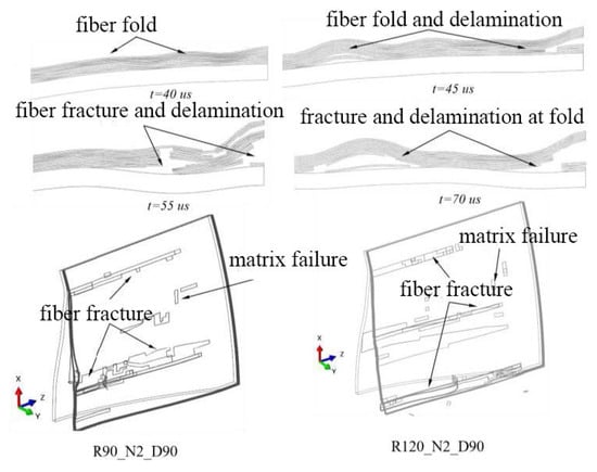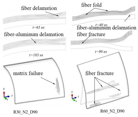In order to analyze the specific influence of curvature on the deformation failure of the fiber layer, the typical failure characteristics of R30_N2_D90 and R60_N2_D90 are shown in Figure 14 as a structural contour diagram. In the x, y plane and the sectional drawing of R30_N2_D90 fiber fracture, fiber drape is not obvious. Fiber in the center uplift and the fiber layer between layers, and layered between the fiber and aluminum plate, due to the large circumferential curvature of the clamping side in the center of the circumferential form stress concentration of the substrate under high tensile and shear stress, suffer matrix fracture. In R60_N2_D90, the degree of fiber fold is strengthened, and the fiber and aluminum plate are seriously stratified in the central uplift. Fiber fracture begins to occur at the fold, and there are many obvious fiber fracture zones on the whole. The above analysis shows that the double-layer CARALL structure with a small radius of curvature has strong impact deformation resistance, which is because the structure with a small radius of curvature has greater bending stiffness. In addition, the incident shock wave on the structure surface has a large incident angle, the transmitted shock wave energy is small, and the overall impulse of the structure is small.