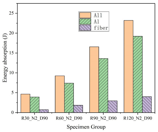 The influence of the number of layers on structural energy absorption is shown in Figure 20. “All” represents the total energy absorption amount of the specimen, “Al” represents the energy absorption amount of the aluminum alloy laminates, and “fiber” represents the energy absorption amount of the fiber laminates. Under the curvature of a single structure, the total amount of structural energy absorption increases with the increase in the number of layers. There is no significant change in the energy absorption of the aluminum plate layer, while the energy absorption of the fiber layer increases more. Since the aluminum plate absorbs the impact energy through plastic deformation, its energy absorption is positively correlated with the maximum deformation at the center, and the number of different layers has no great influence on the maximum deformation at the center, so the number of layers has no great influence on the energy absorption of the aluminum plate. Fiber layer energy absorption mainly occurs due to fiber fracture, matrix fracture, and interlayer stratification. When the structural lamination increases, the number of fiber fractures increases, the number of matrix fractures increases, and the number of laminations and the area of lamination increase, so the energy absorption of the fiber layer increases. Therefore, when other structural parameters remain unchanged, increasing the number of failure layers can increase the number of failures and the failure area of fiber layers, thus improving the energy absorption characteristics of the structure.