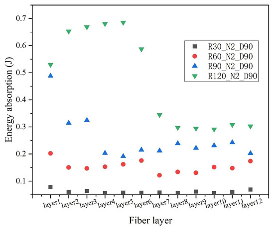 Figure 16 shows the energy absorption of CARALL. “All” represents the total energy absorption amount of the specimen, “Al” represents the energy absorption amount of the aluminum alloy laminates, and “fiber” represents the energy absorption amount of the fiber laminates. As the radius of curvature increases, the energy absorption of the whole structure increases. The energy absorption of the aluminum plate increases with the increase in the curvature radius, and accounts for the main part of the energy absorption of structure. The energy absorption of the fiber layer is about one-quarter that of the metal layer. The energy absorption distribution of each fiber layer is shown in Figure 17. Layer1 is the outermost layer. In general, the energy absorption of fiber is less for a small radius of curvature, while the failure mode of fiber is more complicated for a large radius of curvature, which has strong randomness. Compared with the inner fiber, the outer fiber has more energy absorption, and the difference increases with the increase in the radius of curvature.