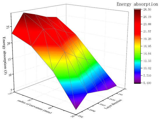 Under the same radius of curvature, D0 and DX have the minimum deformation, and D45 has the maximum deformation. With the increase in curvature radius, the difference between the maximum and minimum deformation increases, while the corresponding energy absorption shows the opposite trend or pattern.