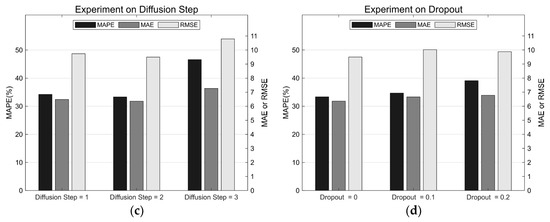 - The diffusion steps of the graph convolutional filter: The diffusion steps affect the model’s ability to capture spatial information. A larger number of steps enable the model to better capture the relationships between the vertices in a network that are distant from each other. However, it may also lead to the overfitting of the model and make it more demanding in computation.