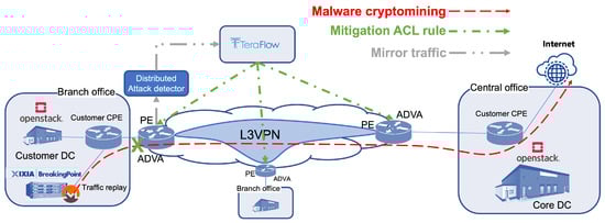 Figure 1. Assuming a typical telecommunication MPLS-based network, a Level 3 Virtual Private Network (VPN) service (L3VPN) is deployed using the TeraFlowSDN controller. The controller activates this service using provisioned templates over the standardized Internet Engineering Task Force (IETF) Network Configuration Protocol (NETCONF) South-Bound Interface against the different Provider Edge (PE) routers from the ADVA manufacturer. In this demonstration, a traffic generator, emulating a branch office, is connected to one PE to replay a mix of normal traffic with cryptomining malware activity. The second PE, the central office, provides internet access offered by the L3VPN service and leverage by the malware. This specific malicious traffic is represented as a red dashed line in