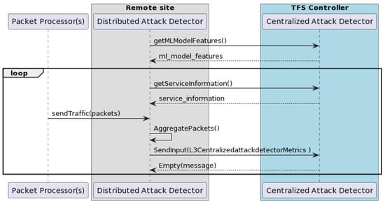 The DAD component receives network traffic at the network edge and generates statistical summaries of the network flows by aggregating packets from the same connection at regular intervals of time. The DAD component then transmits these statistics to the CAD component, which uses them as input to an ML-based network traffic classifier running within it. After a network attack has been detected in the ML classifier, the confidence of the prediction as well as the flow connection identifier are sent to the AM component. The AM component then communicates with several core TeraflowSDN components to enforce and apply the corresponding mitigation strategy in the network elements. For example, based on a predefined policy, it can be decided that flows with the same connection identifier as the attack are blocked on the access router.