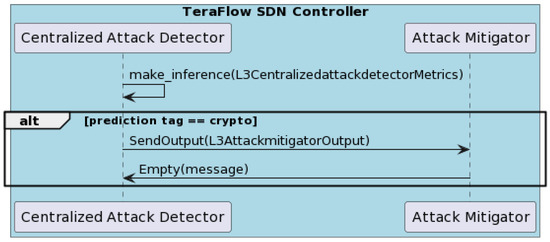 The proposed solution consists of two centralized components, the Centralized Attack Detector and the Attack Mitigator, as well as a distributed component, the Distributed Attack Detector, placed at the edge of the network. Although a specific attack model (cryptomining) was used to demonstrate the integration of the cybersecurity components in TeraFlowSDN, the proposed architecture based on microservices and the adoption of standard interfaces and protocols (Protocol Buffers and gRPC) commonly used in the telco industry will allow for the seamless integration of new types of attack detectors into the TeraFlowSDN controller.