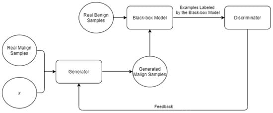 - Hu, W.; Tan, Y. Generating adversarial malware examples for black-box attacks based on GAN. In Proceedings of the Data Mining and Big Data: Seventh International Conference, DMBD 2022, Beijing, China, 21–24 November 2022; Part II. Springer: Berlin/Heidelberg, Germany, 2023; pp. 409–423. [Google Scholar]
