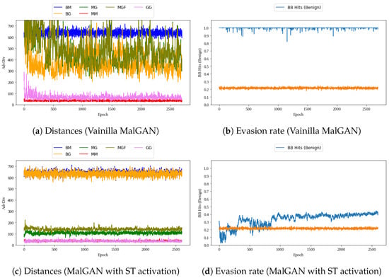 Figure 11, the results obtained for the Vainilla MalGAN are compared to our proposal (MalGAN equipped with ST activation functions). The top row shows the Vainilla MalGAN distances (