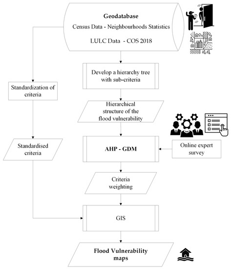 The main objective of this paper is to propose a methodology for flood vulnerability assessment with multiple criteria (e.g., population, buildings, socio-economic, and exposed elements) and sub-criteria, integrating GIS in a multicriteria decision support framework with an AHP-GDM supported by expert opinions (GIS-AHP-GDM). The proposed methodology allies the different expert opinions obtained through an online survey and validated by a mathematical model. The individual consistency of the experts can be evaluated by the CR and the ED when judging the pairwise comparison matrices. The judgments are subject to aggregation of individual priorities, and the rationale for criteria selection, weighting and aggregation is justified based on the choices made in previous studies [29]. The GIS representation of the flood vulnerability index at the neighbourhood level can be used for decision-making since high-resolution spatial data are required to improve the flood risk assessment.