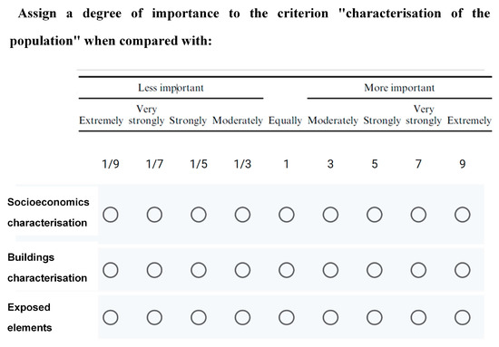 Therefore, an online survey was structured to include the perceptions and priorities of a group of experts concerning flooding in the vulnerability assessment. Experts usually have different attitudes, interests, and knowledge about the problem, which can be reflected in a certain inconsistency in the decision-making process. Therefore, the participation of several experts in the weighting process is considered essential. The online survey was carried out with 25 people (56% from the academic world and 44% from the non-academic world) selected from among flood experts from governmental organisations (8% national laboratories, 12% civil protection authorities, and 8% municipalities), universities (37% professors and 19% researchers from the fields of natural hazards, geographic information, hydrology and hydraulics, and social sciences), NGOs (4%) and private companies (12%), distributed all over Portugal. The composition of this panel allows for different points of view, rather than deriving a single solution based on a single opinion. The number of members of the panel can be considered sufficient, as the experts have to be part of a comprehensive questionnaire. Just as important as the number of members of the group is the variability of the sectors from which they come and their geographical distribution. The survey was conducted online, and the respondents do not know each other. Their participation is limited to the first round of responses. There are three reasons why we did not encourage a meeting between the participants in our methodology: (i) the gathering of group members takes a lot of time; (ii) if the experts are together in a group, this can give some bias to the results. Group dynamics can have some pitfalls, such as members often follow the opinion of the majority or of a more persuasive group member, or they may be concerned with their reputation within the group; and (iii) the method relies on a mathematical validation that, for each criterion, gives higher weights to the most consistent answers. Therefore, it is not possible to follow a group consensus approach and the weighting of each expert in the final priority vector is completed without the intervention of the experts.