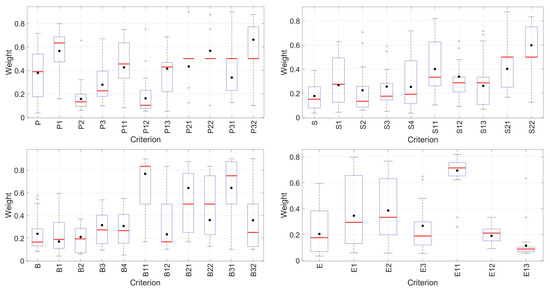Dispersion of individual expert’s weights for each criterion. The red line indicates the median, and the bottom and top edges of the box indicate the 25th and 75th percentiles, respectively. The whiskers extend to the most extreme data points not considered outliers, and the outliers are plotted individually using the plus red symbol. A black dot marks the final group weight for each criterion.