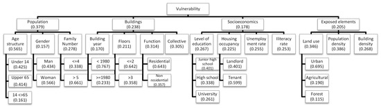 The population criterion is the one that contributes more to the final vulnerability, followed by the building and exposed elements, the socio-economic criterion had the lower weight in the final vulnerability.