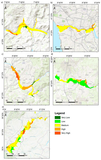 Flood vulnerability in five of the flood-prone areas: (a) Régua (Douro River); (b) Porto/Vila Nova Gaia (Douro River); (c) Coimbra (Mondego River); (d) Águeda (Águeda River); (e) Abrantes/Santarém/Vila Franca Xira (Tagus River).