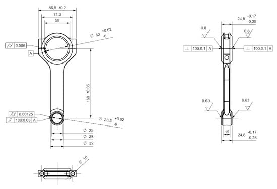 As shown in Figure 1, the research object of this article is a 160 mm h-type connecting rod for Volvo b200/b230 engines. The three orthographic views of the automobile connecting rod are shown in Figure 2. The connecting rod data in this paper comes from the historical data of factory processing and production.