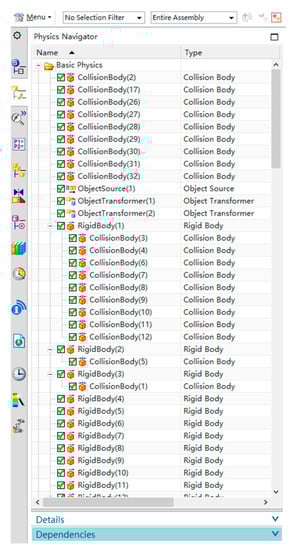 Before the geometric, three-dimensional model is given the attributes of electromechanical objects, it does not have physical attributes such as gravity or collision. Only after the basic electromechanical object features of the geometric, three-dimensional model are given, can the motion simulation of physical attributes be carried out. By setting the corresponding electromechanical properties of the corresponding parts in the geometric three-dimensional model, the purpose of controlling the simulation motion of the model is realized. The definitions of a collision body and a rigid body are shown in Figure 6.