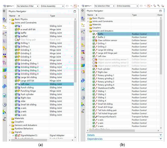The electromechanical properties include object source, object converter, object collector, collision material, and so on. The coupling properties include kinematic pairs (such as hinge pairs, sliding pairs, fixed pairs, cylindrical pairs, etc.), coupling pairs, sensors, constraints, etc. In addition, there is also the definition of the actuator, which is mainly to set the position control or speed control of the actuator. The kinematic pair settings are shown in Figure 7a. The settings of sensors and actuators are shown in Figure 7b.