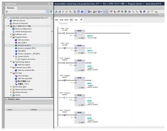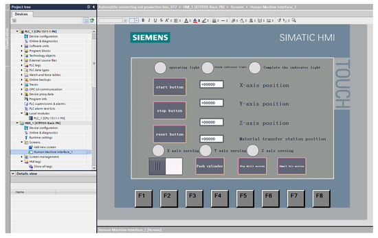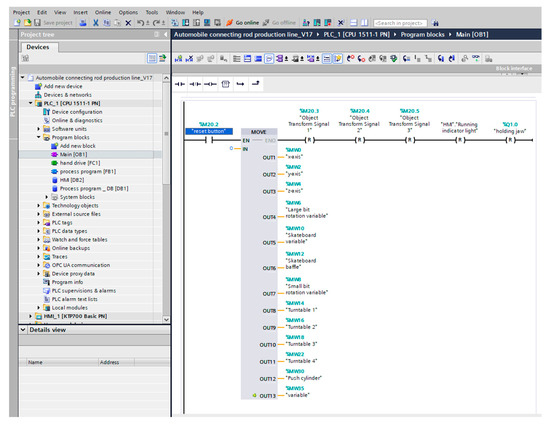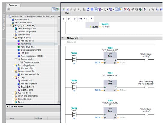 The HMI displays the current working state in real-time and controls the model in NX MCD through the HMI. The interface includes manual/automatic mode switching, manual control of the pushing cylinder, large bit movement, small bit movement, real-time display of the position of the X, Y, and Z axes, start button, stop button, reset button, and so on through the IO domain to cooperate with the PLC operation control program. The human-machine interface is shown in Figure 13. The X-axis, Y-axis, and Z-axis zeroing programs are shown in Figure 14.