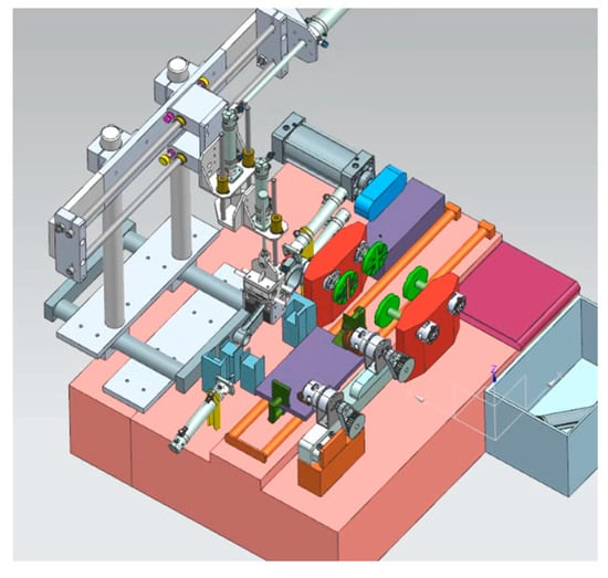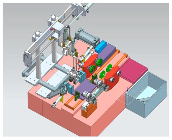 According to the design requirements of the automobile connecting rod production line, the design and construction are carried out in the NX CAD module based on the processing method of the automobile connecting rod given in Table 2, and the sketches of each component are drawn accordingly. After stretching, rotating, and other operations, the geometric three-dimensional model of each component is constructed, and then the corresponding constraints are performed to complete the assembly. Finally, the model of the automobile connecting rod production line is established.
