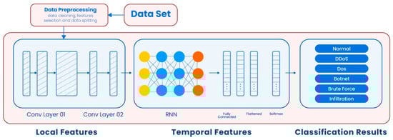 The CNN first processes the input in the HDLNIDS network, and the output is subsequently sent to the recurrent layers, which produce sequences at each timestep, allowing for the modeling of both spatial and temporal characteristics. The resultant sequential vector is then input into a layer of SoftMax for the probability distribution over the categories after passing through a set of two fully linked layers.