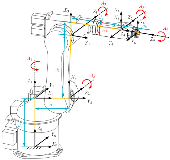 As shown in Figure 1, link frames based on the DHm model are established, numbered 0 to 6. Among them, the Frame 0 is the base frame, which origin is located at the robot base and is solidly connected to the ground as a reference frame to describe the poses of other joints of the robot. The DHm parameters of the KUKA KR60-3 robot are shown in Table 1. The link frames are defined as: