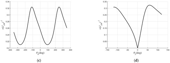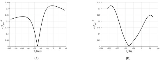 As shown in Figure 3, means a singularity, and the maximum value of is the pose mentioned above. The value of represents the distance from the singularity. The larger the value of , the further the distance from the singularity and the better the dexterity of the joint. The rotation range of joint 4 exceeded 360 degrees, so there were two maximum values of .