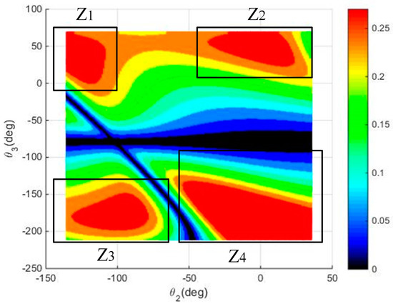 Figure 5 shows the contour drawing of in the 2 and 3 joint spaces. It can be seen that there are four areas where larger values can be obtained (far from the singularities). The Z2 area cannot be selected because of the limitation of the experimental space (the robot pose in this area cannot be reached in the laboratory), and the Z3 area cannot be selected because the end of the robot is too close to the ground, so it is hard to measure. Therefore, the Z1 and Z4 areas are selected as the poses to identify the joint stiffness of the robot.