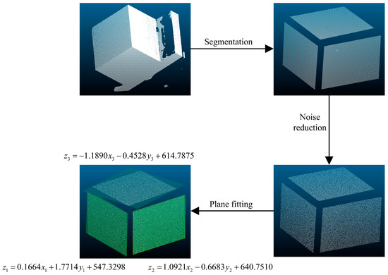 The measurement of the robot EE displacement is obtained by the EE target block displacement. The 3D scanner is used to obtain high-precision initial 3D point clouds of the surface of the target block at the end of the robot. The initial 3D point clouds need to be fitted to obtain the expression for the point cloud planes to set up the deformation coordinate system. The 3D point clouds usually contain noise points that will affect the accuracy of the deformation coordinate system. The processing of 3D point cloud data mainly includes segmentation, noise reduction, and plane fitting of the point clouds. The segmentation processing of the point clouds obtains three mutually vertical planar point clouds of YOZ, XOZ, and XOY. The noise reduction processing is to remove the noise points in the 3D point clouds. The plane fitting processing obtains the expressions of the point cloud planes. One experiment for an illustrative example was chosen to describe the procedure for obtaining the EE displacement (see Figure 7). z1, z2, and z3 represent the fitted YOZ, XOZ, and XOY plane equations of the target block, respectively.