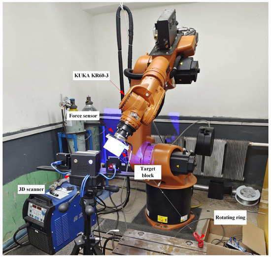 In Figure 9, the experimental system consists of a robot, a 3D scanner, a six-dimensional force sensor, a rotating ring, and a target block. The workspace radius of the KUKA KR60-3 robot is equal to 2033 mm, and the repeatability is ±0.06 mm. The force sensor and target block are rigidly attached to the robot flange. The measurement system must ensure fast and accurate measurements of multiple poses in the Cartesian workspace, for which a 3D scanner VTOP 200B from TECHLEGO (TIANJIN) CO., LTD was used. The parameters of the 3D scanner are shown in Table 3.