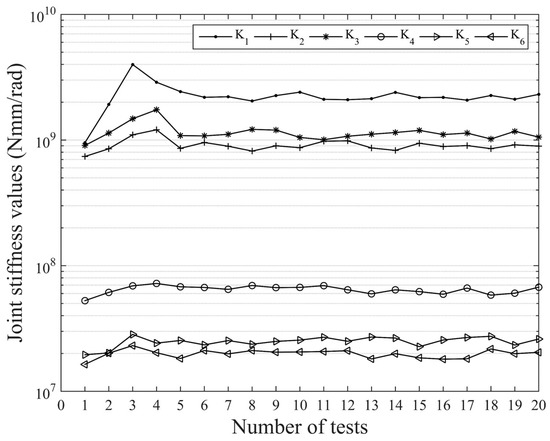 According to Equation (25), the Jacobian matrix can be obtained for a specific robot configuration, and the matrix can be obtained when the external forces and moments are measured by a six-dimensional force sensor. The robot EE deformation can be obtained by the method in Section 4.2. Therefore, to analyze the robustness of the method, can be obtained by Equation (24) with one test. As shown in Figure 10, the joint stiffnesses , , , , , and were obtained by the method for tests, . Twenty groups of tests were randomly selected. The convergence of joint stiffness values becomes better as the number of tests increases and the results are more reliable. When the number of tests is higher than five, the joint stiffness identification method is considered to be robust.