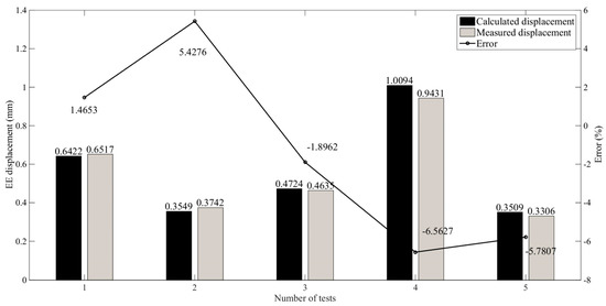The robot configuration for validation experiments is shown in Table 6. The calculated and measured EE displacements are shown in Figure 11. The validation is realized by a random set of five poses in the Cartesian workspace. The calculated EE displacement is indicated by dark-colored bars, and the measured EE displacement is indicated by light-colored bars. The line indicates the relative error of the two displacements. The errors are less than 10%, which proves that the calculated displacement values are close to the measured displacement values. Therefore, the joint stiffness identification method is feasible.