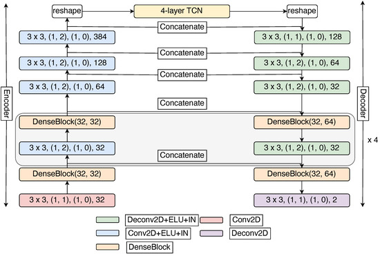 The detailed setup for the TCN-DenseUNet is also shown in Figure 2. DenseNet block is represented by DenseBlock, where and are the growth rates for the first four and the last convolutional block, respectively. Other convolutional blocks are represented in the form of , where are the kernel size, stride, padding, and output channels, respectively.