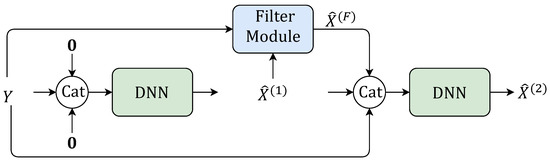 The training of this framework still adopts a two-stage strategy. In the first stage, the noisy spectrum Y are concatenated with two zero matrices of the same shape and fed to the DNN to estimate the clean spectrum. In the second stage, two iterations are required to produce the final output. In the first iteration, similar to the first stage, Y, concatenated with two all-zero matrices, is fed into the DNN, and the initial estimate of the clean spectrum, , is obtained. and Y are used to calculate the filtered spectrum . In the second iteration, the noisy spectrum Y, the result of the previous iteration , and the filtered spectrum are concatenated and fed into the neural network to obtain the final output .