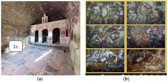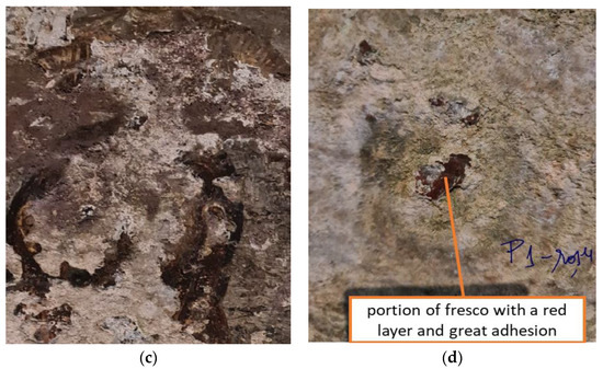 Due to the infiltration of meteoric water through the sandstone wall in which the church was carved and the prevailing climatic conditions within the church, exacerbated by microbiological action, the fresco within the church has undergone significant degradation (Figure 1). Large portions of the fresco have come off the wall. The biological colonization, facilitated by the cave church’s environmental conditions, resulted in the growth of bacteria and algae, which covered the pictorial surfaces, particularly those on the northern wall. Eventually, this led to the deterioration of the frescoes, as veils and crusts formed. Parts of the fresco were still visible 12 years ago [4].