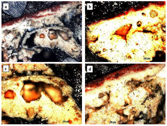 The analyzed sample shows a continuous red pictorial layer, which in certain areas penetrated through the existing cracks in the mortar before its application (Figure 2a). The matrix has inclusions, cracks, pores, and even voids (Figure 2b). The cracks observed are short in length, with some of them appearing some are detached from the tip of the straw insert, as shown in Figure 2c,d. The quality of the inlay-mortar interface is good, as no cracks have developed along its length that extends from the interface to the interior of the mortar. An area of carbonic residue can be observed following the degradation of the straw inserts used in the preparation of the mortar (Figure 2a,c). The microstructure shows open, yellow–orange, large, rounded phases inside the mortar (Figure 2c,d), while others are small and globular and located near the compaction defects. The observed light separations may be attributed to the presence of precipitates or the use of organic additives, such as sheep tallow or mineral oil, which were commonly utilized during that time period to enhance the quality of the mortar.