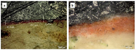 The pictorial layer in Figure 3 has a thickness between 71.7 and 81.5 µm (Figure 3a). Above it, a remnant of the carbonation layer formed during the drying of the fresco can be identified (Figure 3b, top right). The carbonation layer on the surface of the pictorial layer has a protective role and determines the transparency of the color and a decrease in its intensity [11]. Under the red pictorial layer, there is a thick area of pink color from the diffusion of the red pigment in the wet mortar (Figure 3b) [7,11].