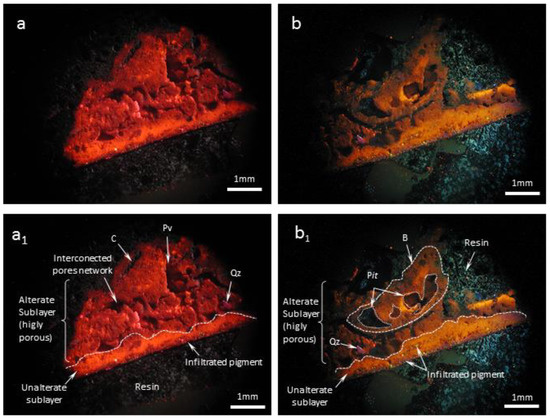 Figure 4. Cathodoluminescence analysis. Fragment of the fresco with two distinct areas: an external unaltered sublayer and an internally altered layer with high porosity. (a1) interpreted image of image (a,b1) interpreted image of image (b) Qz-quartz; C-fragment of carbonized plant (straw); PV-vacuolar porosity; B-bioclast; Pit-intraparticle porosity.